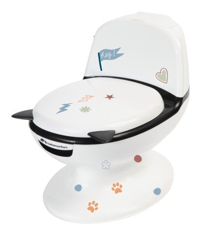 Le déflecteur et la lunette relevable facilitent l'utilisation pour les garçons comme pour les filles, tandis que la cuvette amovible facilite le nettoyage pour les parents.