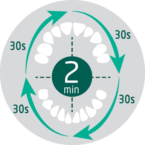 - La brosse change de vibration toutes les 30 secondes pour indiquer le passage à une nouvelle zone et s’éteint automatiquement après 2 minutes.
